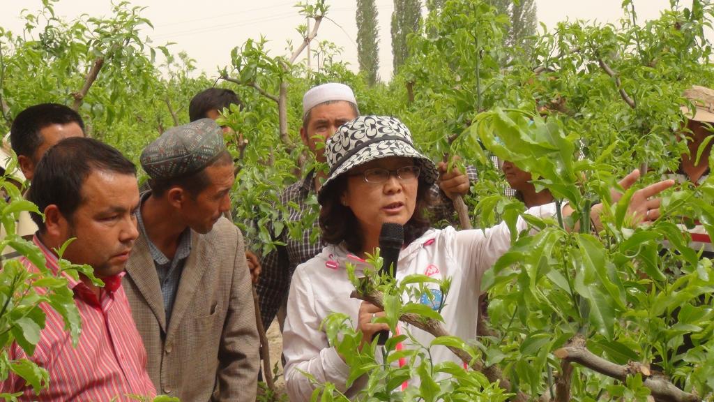 吴翠云(前有一)在为和田地区洛浦县农民传授枣树夏季修剪技术。/佚名