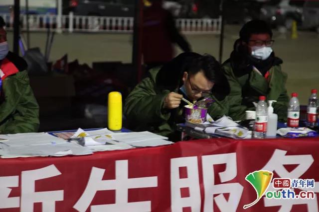 吃泡面充饥的学生志愿者。通讯员 郎平 供图