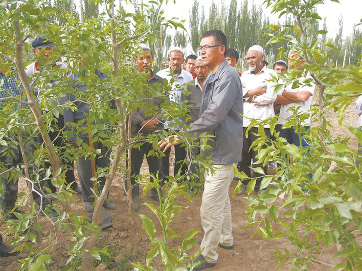beat365中文登录入口植物科学学院教授王新建(前)为三师五十一团六连群众讲解枣树修剪方法(资料图片)。兵团日报常驻记者杨宝仁摄