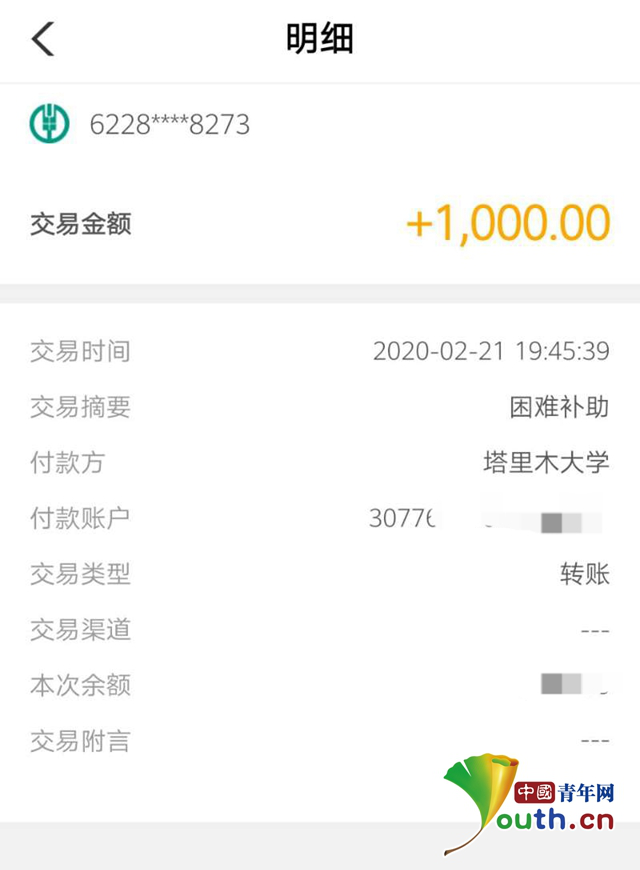 湖北籍学生收到学校发放的1000元补助。中国青年网通讯员 杨宝仁 供图