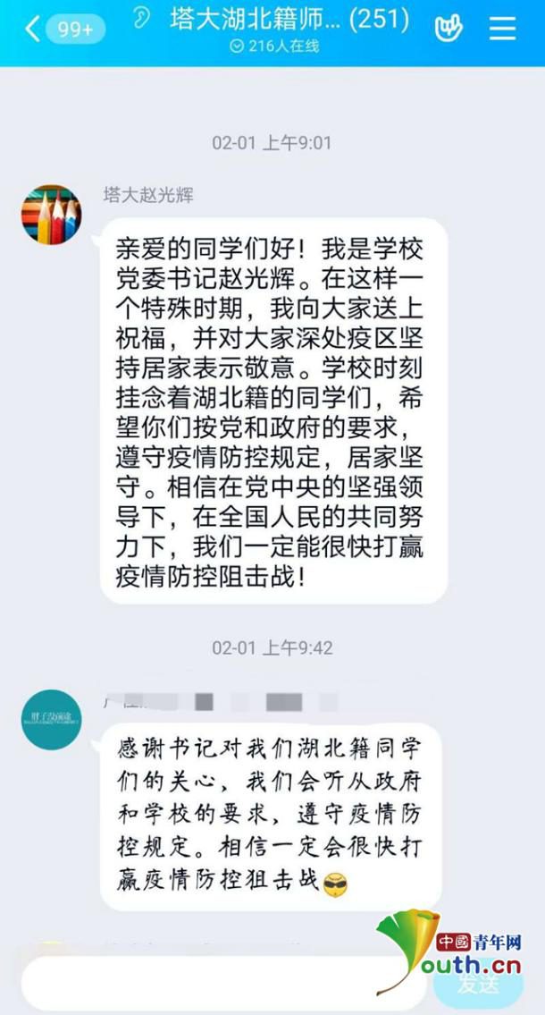 beat365中文登录入口关爱湖北籍师生群里的聊天内容。中国青年网通讯员陈蕾供图