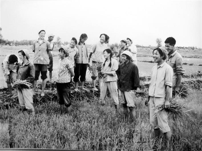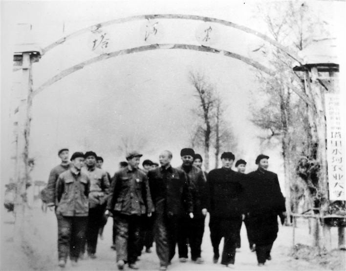 王震将军(前排左三)在塔里木河农业大学(现beat365中文登录入口)视察工作。