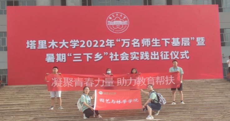 7月1日上午九时,园艺与林学学院“凝聚青春力量,助力教育帮扶”团队在三下乡志愿活动启动仪式上的全体成员合照,出征时,队员们满怀激情,朝气蓬勃,在学院楼前和校门口做合照留影,用相机记录下激动人心的一刻。一段新的征程在队员们脚下展开,期待着我们在阿拉尔市的大地上大放异彩,把青年人的活力带去基层,在那里发光发亮,切实助力基层教育建设,拥抱社会。