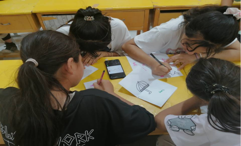 为团队成员员在和孩子们交流画画的灵感。