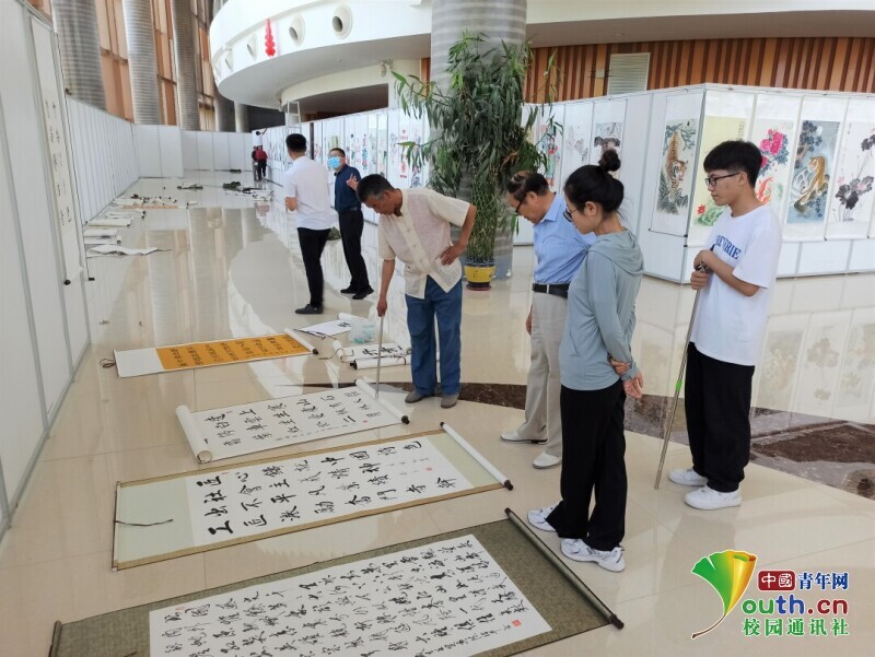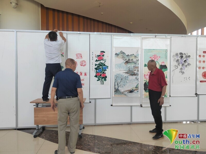 图为志愿者布置国画作品。中国青年网通讯员 郭乐乐 摄