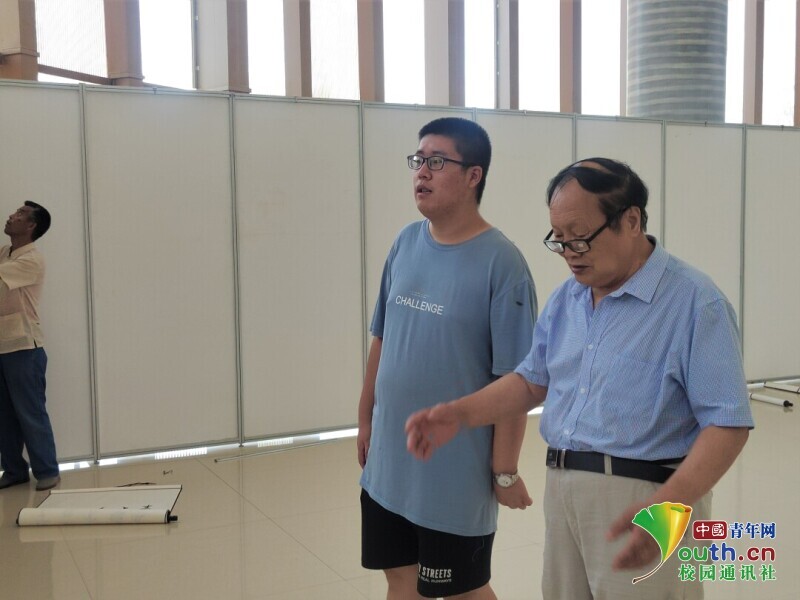 图为志愿者与老年书画协会会长探讨展览布局。中国青年网通讯员 郭乐乐 摄