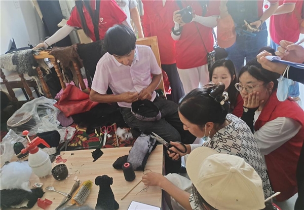 图为团队成员观摩学习卡拉库尔胎羔皮帽制作工艺。通讯员 高洁 摄