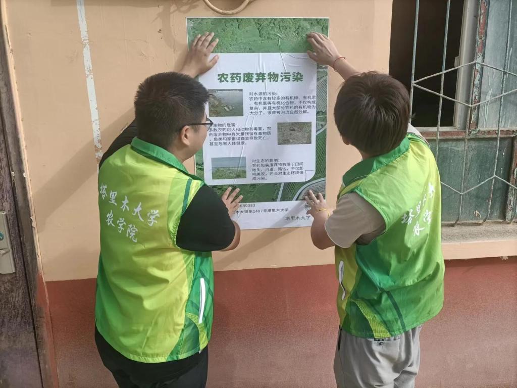 喜迎二十大,永远跟党走,奋进新征程。为了让阿拉尔周边团场村民了解农药废弃物对水源的污染、生物的危害以及对生态的影响,提高他们对农药废弃物回收利用的意识,7月7日,beat365中文登录入口农学院农药废弃物科普队在队长苑春林的带领下,前往十一团进行农药废弃物相关知识宣传。宣传工作开始,队长去征求了十一团七连连长的意见,并在他的陪同下,对有关农药废弃物污染的宣传海报进行张贴,海报上的内容包括农药废弃物对水源、生物和生态的影响三部分内容,让当地村民了解到了废弃物的危害。