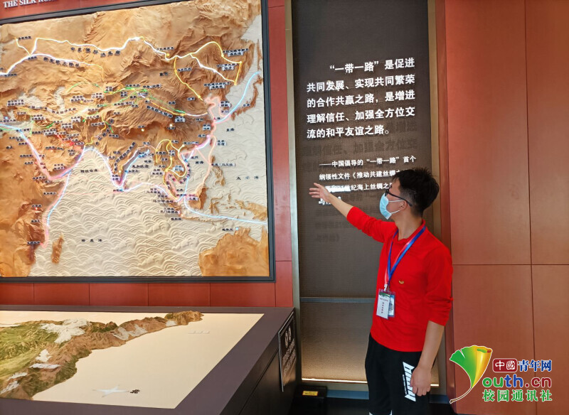 图为实践队员就一带一路的发展及演变对旅游游客做一讲解和重温。中国青年网通讯员 高继洋 摄