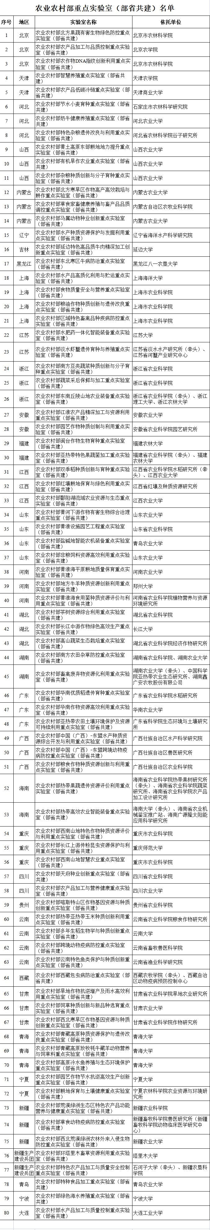 附农业农村部重点实验室(部省共建)名单如下