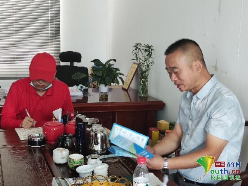 图为实践团成员给企业负责人发放宣传手册。中国青年网通讯员 高亚梅 供图