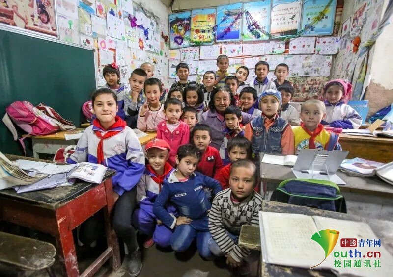 图为潘玉莲在位于新疆喀什地区疏勒县的爱心小课堂与学生们合影。 中国青年网通讯员 谭媛 摄