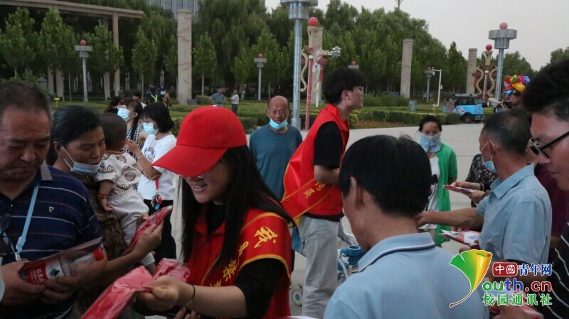 图为团队成员给过往群众分发禁毒防艾宣传单和礼品。中国青年网通讯员 尹亚伟 供图