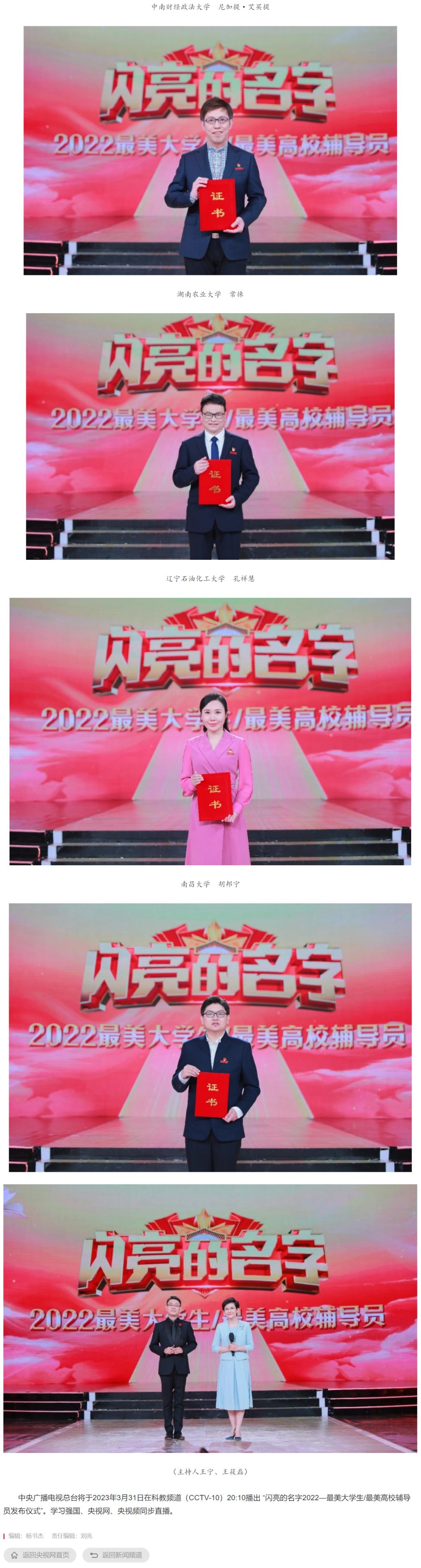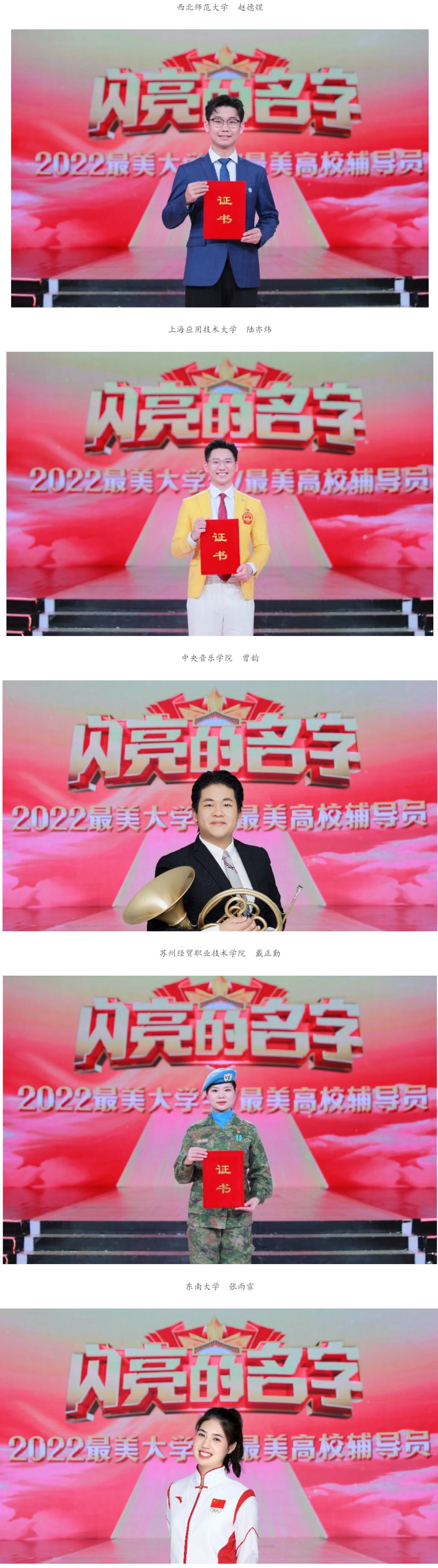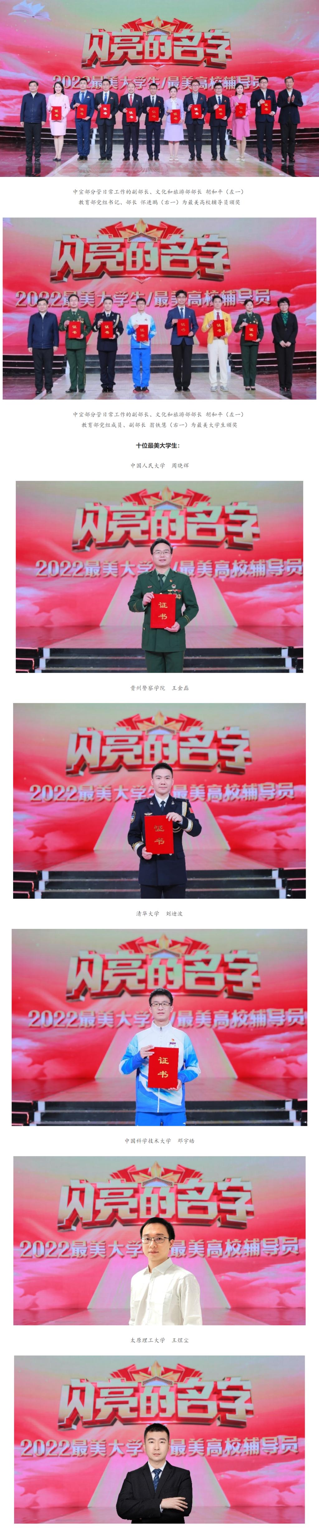 为深入学习贯彻习近平新时代中国特色社会主义思想和党的二十大精神,充分展示大学生和高校辅导员争当先锋、勇挑重担的精神风貌,近日,由中宣部、教育部和中央广播电视总台联合主办的《闪亮的名字2022——最美大学生/最美高校辅导员》发布仪式录制完成。