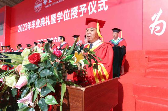 中新网新疆新闻6月19日电(杨保仁)仲夏之时、万物并秀。老水塔边上的天山祥云百花争艳,满校园的沙枣花香气四溢,让塔大的夏天成为最缤纷的季节。空气中洋溢着莘莘学子的欢声笑语,充满了青春挥洒的丰收喜悦,交织融汇成了校园里最迷人的风景。今天,我们怀着无比喜悦的心情,在这里隆重举行2023届毕业生毕业典礼,向5211名毕业生同学表示最热烈的祝贺,向辛勤培育你们的师长、父母和亲友致以最诚挚的感谢。