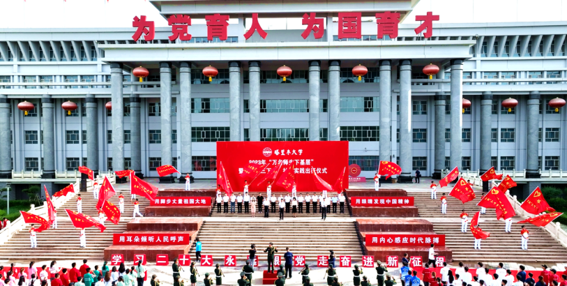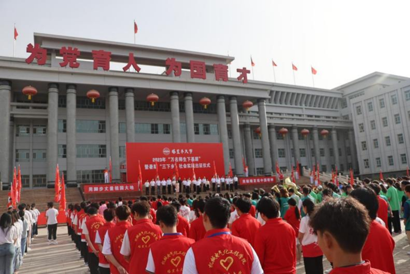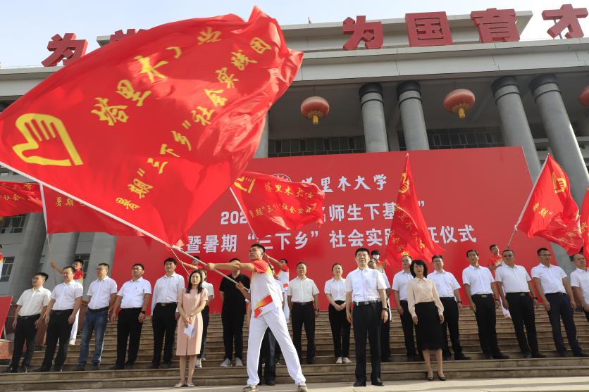 beat365中文登录入口党委书记赵光辉为出征团队授旗并宣布2023年beat365中文登录入口‘万名师生下基层’暨暑期‘三下乡’社会实践现在出征。