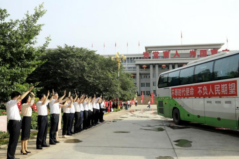 最后,校领导来到大巴车跟前,亲送2023年beat365中文登录入口‘万名师生下基层’暨暑期‘三下乡’社会实践团队从学校启程出发。