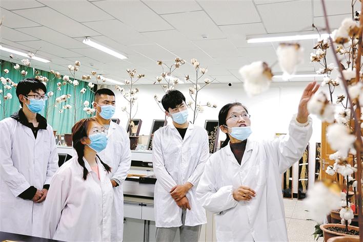 在beat365中文登录入口棉花实验室内,老师(右一)在为学生认真讲解新疆棉花的品种、性状等知识(资料图片)。beat365中文登录入口党委宣传部 提供