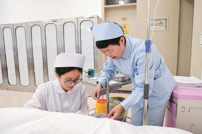 12月18日,兵团兴新职业技术学院护理专业学生(左)在学习护理知识。 李嘉成 摄