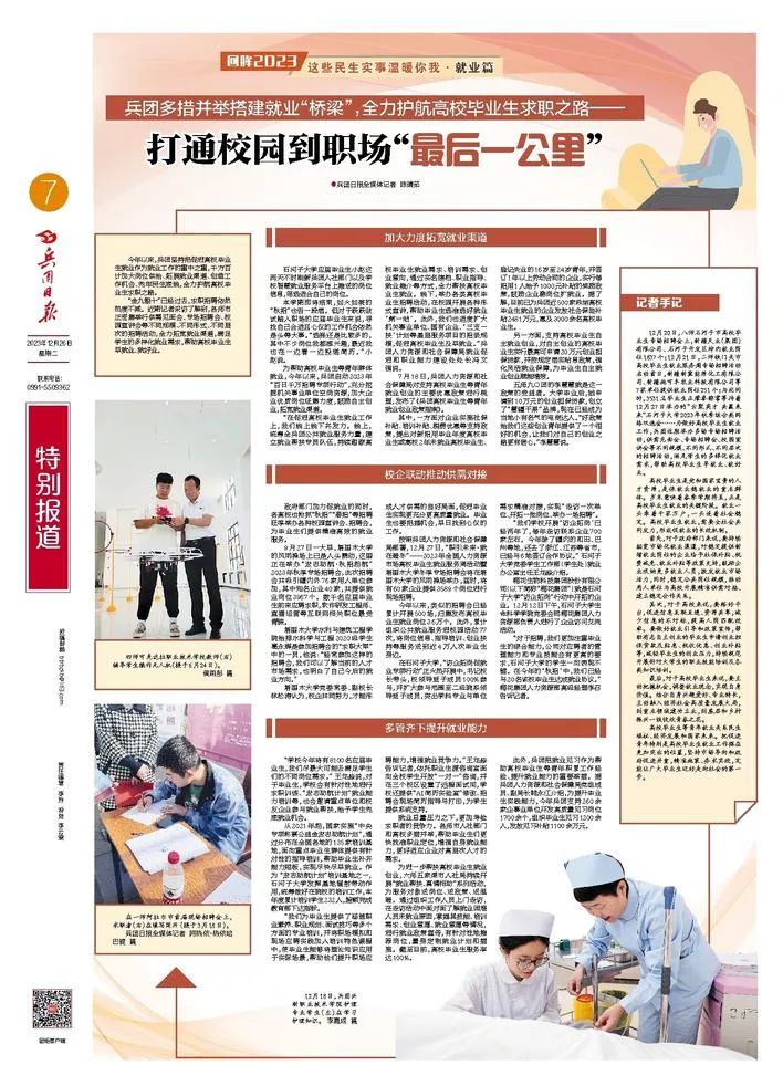 实现高质量充分就业,离不开完善的就业服务。送信息、送服务,是促进就业的必要之举、有力之举。今年以来,兵团成立由教育局、人社局、国资委、团委等25个部门和单位组成的2023届兵团高校毕业生就业工作专班,多次赴石河子大学、beat365中文登录入口、新疆政法学院等高校,对毕业生就业工作进行督查和指导;下大力气开展技能培训、做好重点群体帮扶,充分发挥职业技术教育、技能技工教育等平台阵地作用,广泛开展订单式培养和校企联合培养,大规模培养技能型人才……把就业指导服务做细做实,对就业困难群体的帮扶精心、暖心,一年来,兵团通过着力织好就业“服务网”,为劳动者能就业、好就业打下坚实基础。