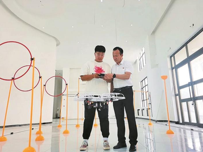 四师可克达拉职业技术学校教师(右)辅导学生操作无人机(摄于6月24日)。 侯雨彤 摄