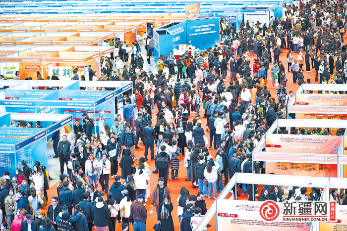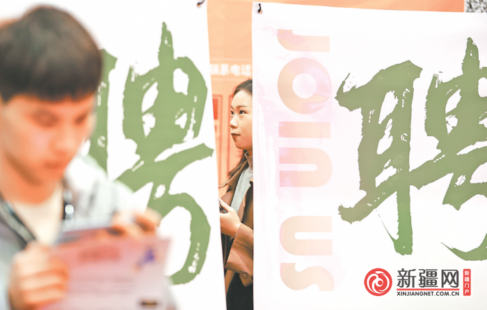 当天,新疆农业大学不仅有组织地带着1000名学生现场求职,还有20名老师也穿梭在各招聘展位前。