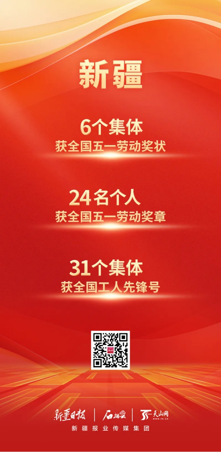 4月28日,2024年庆祝“五一”国际劳动节暨全国五一劳动奖和全国工人先锋号表彰大会在北京人民大会堂举行,255个集体和1088名个人分获全国五一劳动奖状、奖章,1034个集体获全国工人先锋号。新疆6个集体获全国五一劳动奖状,24名个人获全国五一劳动奖章,31个集体获全国工人先锋号。