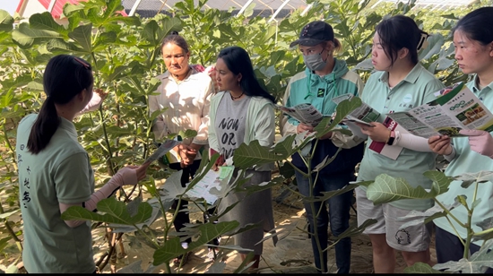 苏宇霞是新疆皮山无花果科技小院驻点研究生,是团队中为数不多的南方女生。以前,农场设施大棚的无花果树长得很高,坐果节位也高,导致产量不佳。在科技小院,苏宇霞主攻无花果矮化技术及控冠技术研究,控制无花果的长势,降低坐果节位,提高产量。