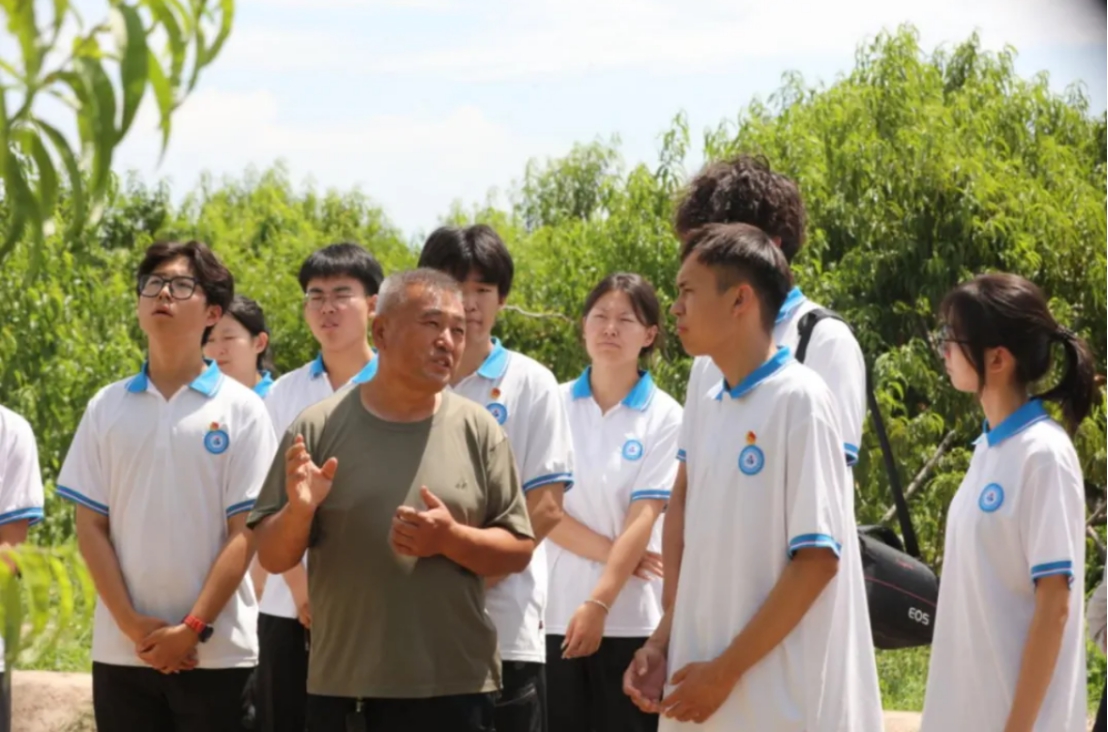 实践团成员听取一四三团九连职工讲解蟠桃种植技术。