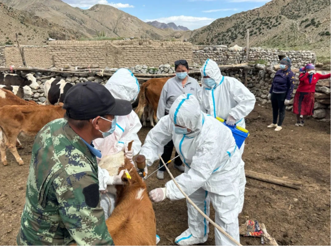 服务团成员在巴音库鲁提镇牧区为牧民的牛接种布病疫苗。
