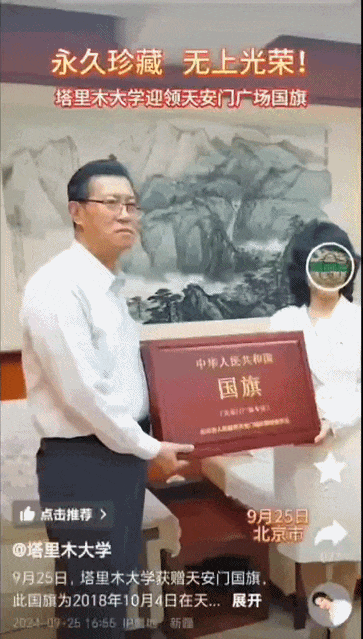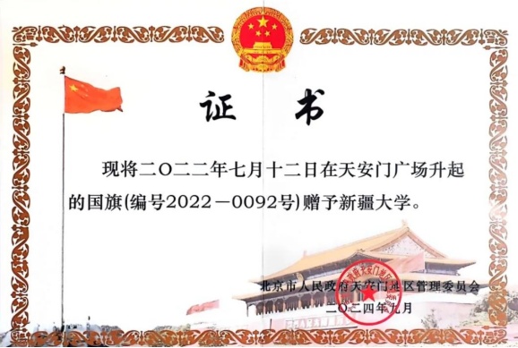9月6日,北京市人民政府天安门地区管理委员会向新疆大学赠送国旗。这面国旗于2022年7月12日在天安门广场升起,被新疆大学校史馆珍藏。