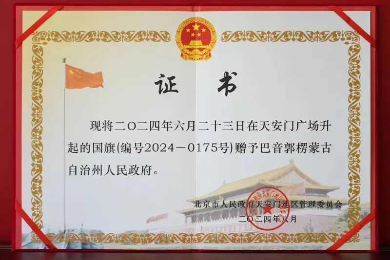 8月30日,北京市人民政府天安门地区管理委员会向巴音郭楞蒙古自治州赠送天安门广场国旗。这面国旗于2024年6月23日在天安门广场升起。