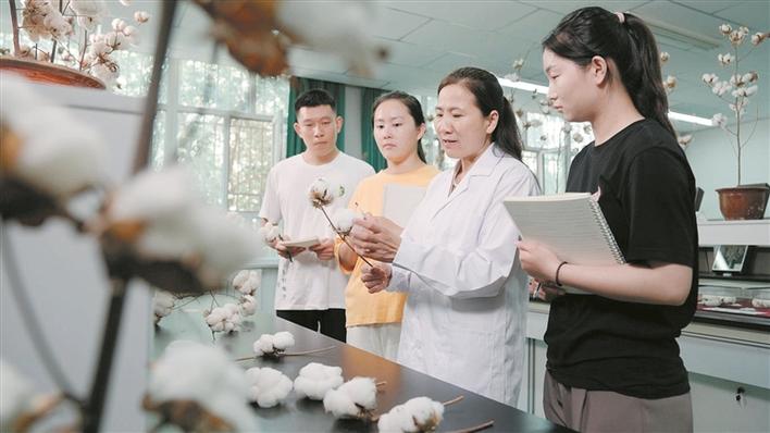 beat365中文登录入口农学院教授万素梅(右二)指导学生做棉花试验(资料图片)。