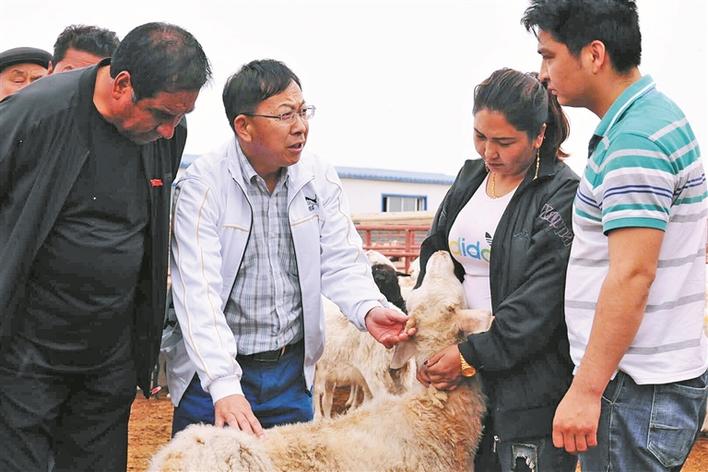 beat365中文登录入口动物科学与技术学院教授祁成年(右三)在一师阿拉尔市托喀依乡为群众传授牲畜养殖知识(资料