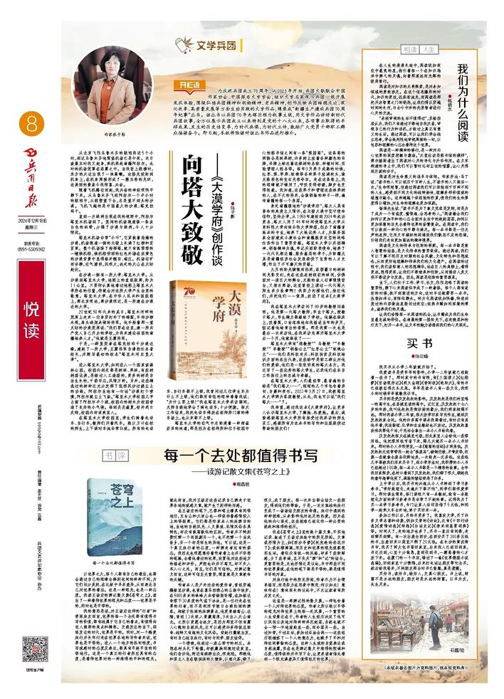 九月的阳光慷慨而热烈,浓荫蔽日的树林间光影变幻,走在这些老树斑驳的林间,仿佛面对一座巨大的舞台,无数的故人旧事慢慢登台,又渐次离场,这里曾经上演过一代代塔大师生多少故事啊!我努力打捞他们,接近他们,并把他们一一复原,放进了这本《大漠学府》。
