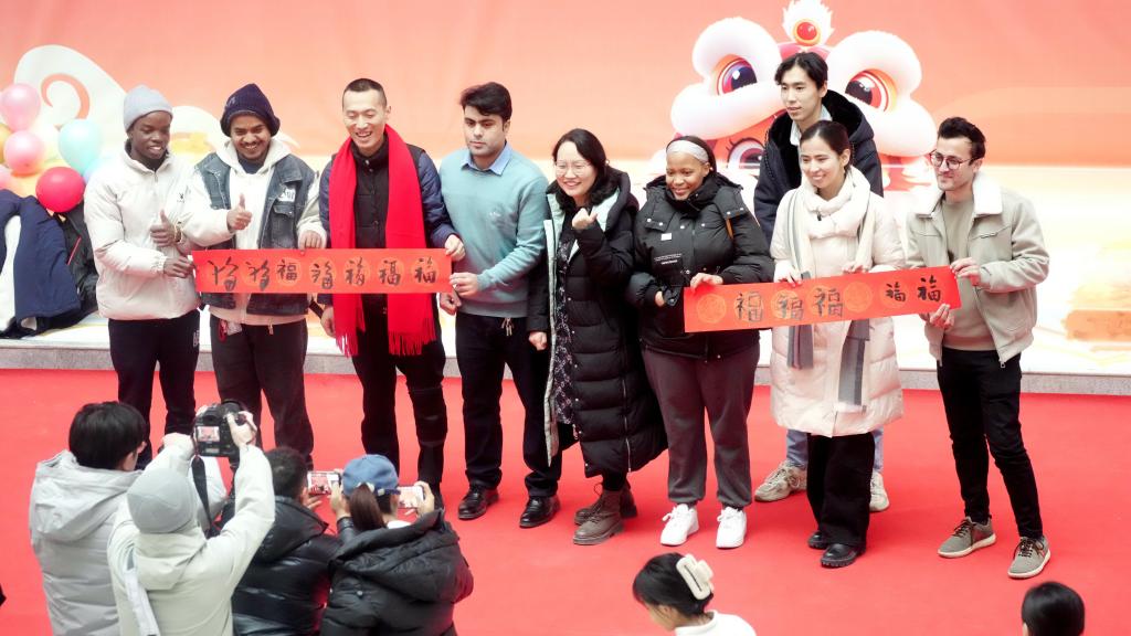 1月10日,几名留学生在beat365中文登录入口迎新春文化活动中录制拜年视频,与学校师生共同迎接新春佳节的到来。兵团日报全媒体记者 王志清 摄
