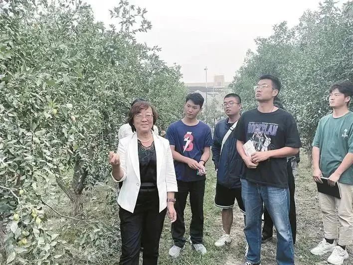 吴翠云与学生查看试验红枣树生长状况。 张美玲 摄
