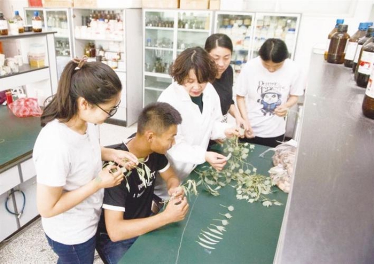 李志军(左三)带领学生在实验室研究胡杨(资料图片)。