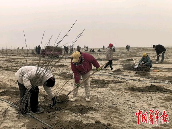初春的戈壁滩上正逢沙尘暴,风裹着沙砾撞向人脸。王军扬透过漫天黄沙,望见老乡们正抡着铲子,在岩层般的硬土上凿坑。沙土飞扬,刚埋下的沙棘苗,在风里扎下了根。