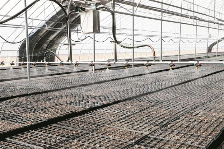4月22日,在阿拉尔国家农业科技园区智能温室大棚内,随着智慧喷灌设备匀速前行,水雾均匀喷洒到胡杨幼苗上。 兵团日报全媒体记者 郑娅莉 陈琼 常驻记者 林国强 摄