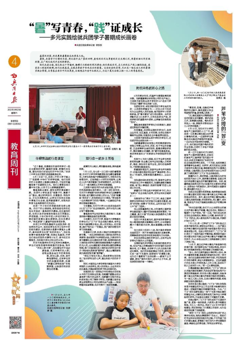 当博物馆的声声赞叹与果园的剪枝声交响,当生产线上的精准操作与村史馆的生动讲解共鸣,这个暑假,兵团学子以多元实践勾勒成长模样。他们的实践故事各不相同,却共同汇成一曲“不负韶华、砥砺前行”的青春之歌,也为这个暑期写下生动注脚——教育不止于课堂,更在广阔的天地中;成长不止于书本,更在亲身实践的每一个瞬间。