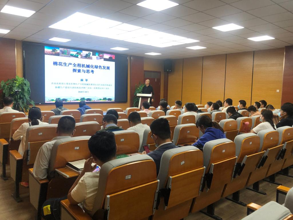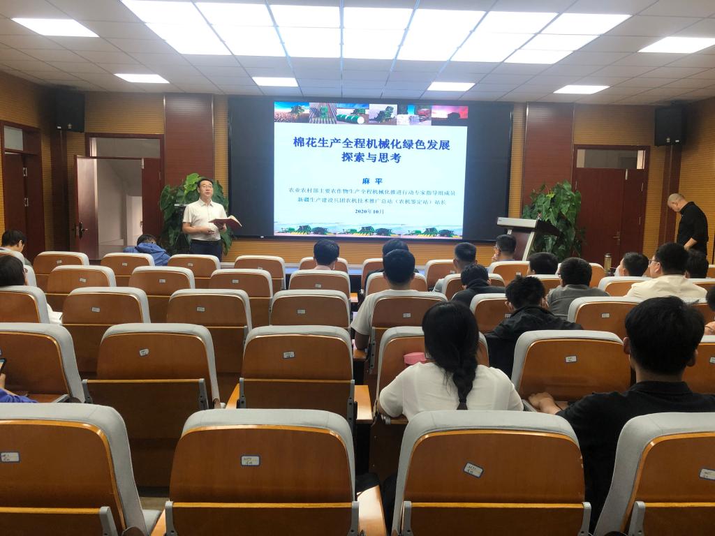 麻平分别作了题为《棉花生产全程机械化绿色发展探索与思考》《北斗智能装备在兵团农业的应用现状及发展思考》的学术报告。对棉花生产全程机械化情况,以及实现棉花生产全程机械化社会效益、经济效益等情况进行了全方位讲解。对北斗智能装备在兵团农业的应用现状、北斗智能装备在兵团农业应用中存在的问题及发展方向,作了详细讲解。
