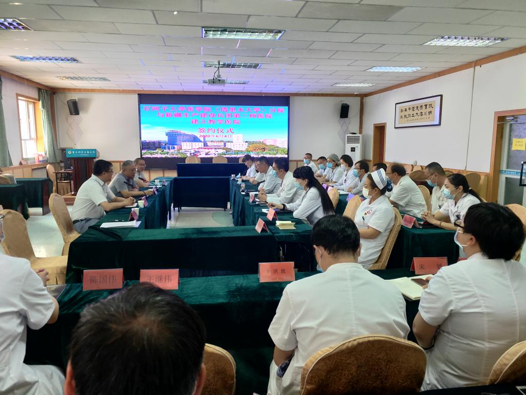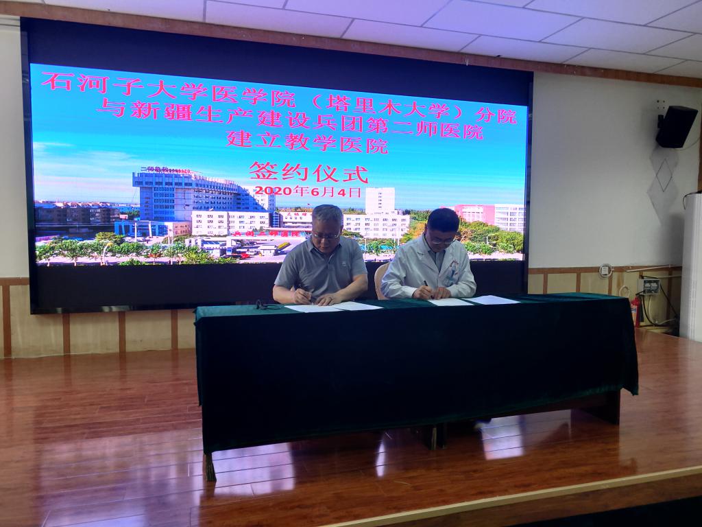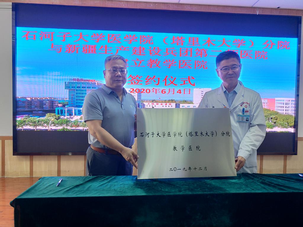 谢建新与第二师医院签订教学医院协议书并授牌。