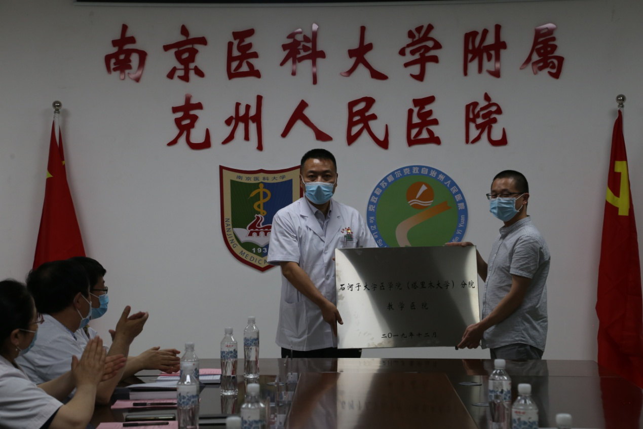 医学院谢建新与喀什地区第一人民医院、第三师医院、克州人民医院、图木舒克市人民医院分别签订《教学医院协议书》,并举行实践教学医院授牌仪式。