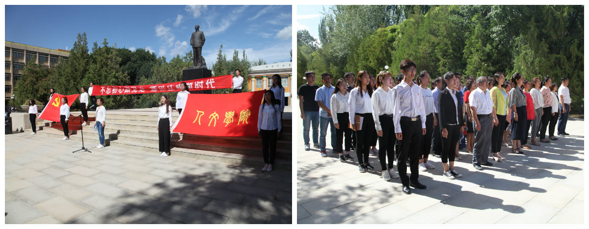 在建党98周年即将到来之际,人文学院党委于6月26日在红色广场王震将军像前举办“我的初心”主题党日活动。全体肃立,奏唱国歌,活动在庄严的国歌声中正式开始。人文院党委副书记雷长柱,学院党委委员,全体师生党员参加活动。