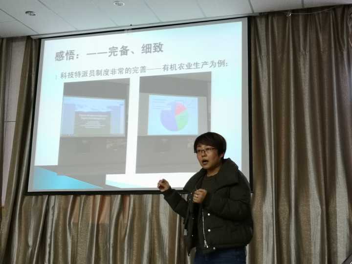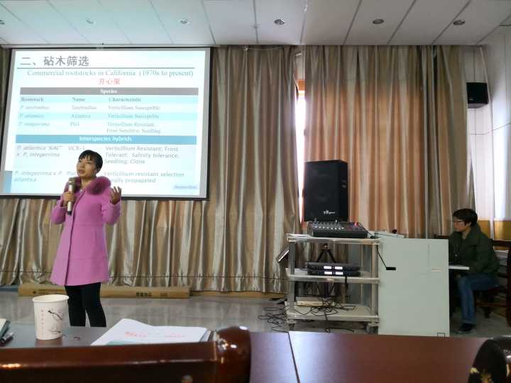 交流会中,张娟老师就美国加州大学本科生实践创新培养模式作了详细介绍,并与学院人才培养进行对照比较分析。张锐、包建平、陈立平老师分别介绍了美国生产现状及管理模式等,就美国科技人员服务农业模式、干果栽培模式等做了详细介绍。