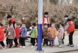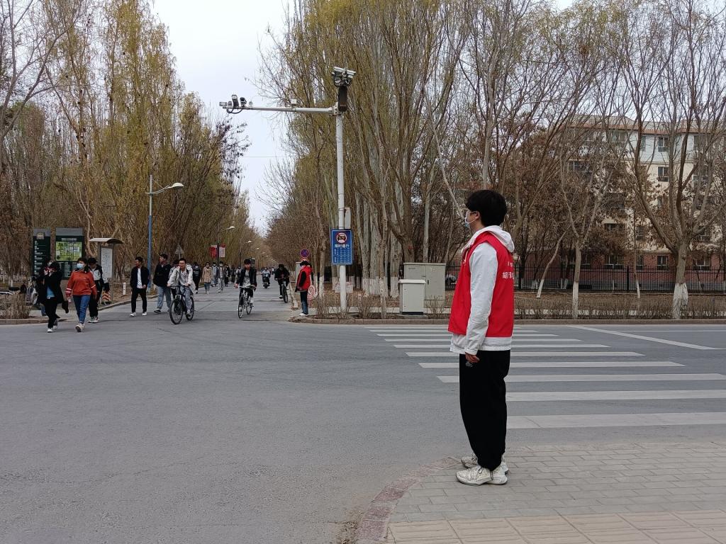 志愿者们身穿红色志愿服,在食堂、主要交通路口、教学楼等公共区域进行文明劝导,提醒师生不聚集、戴口罩、讲卫生、勤洗手、常通风。