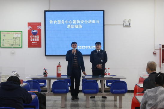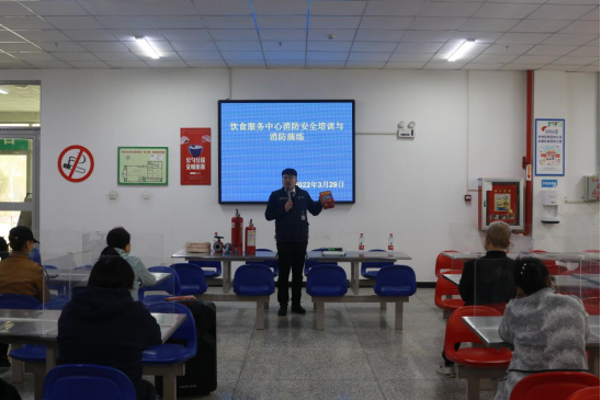 3月29日下午,饮食服务中心在第四食堂开展消防安全知识宣讲和消防应急疏散演练。兵团天安消防安全培训学校老师赵玉龙应邀授课,师市消防支队、学校保卫部安全生产科工作人员、食堂全体管理人员和员工参加。