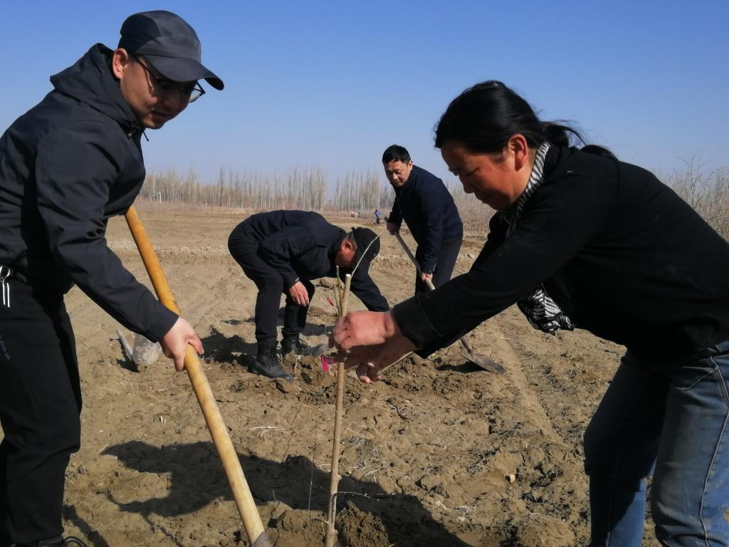 今年,工作队组织两户职工建设有机绿色水果采摘园。在第一批新品果树即将种植时,工作队赶往采摘园和种植户一起种植果树,并探讨后期采摘园规划建设事宜。职工库尔班的采摘园也刚种下了果树苗,为了防止果树苗遭受动物的啃食,工作队帮助他一起扎防护网,同时联系购置铁丝网围栏,为采摘园进一步建设打下了基础。