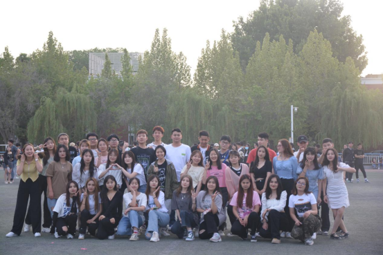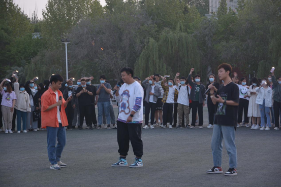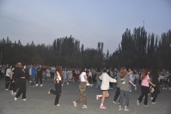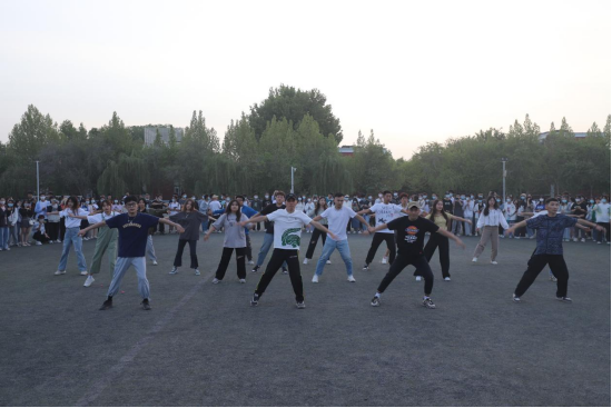 大家跟着响亮的节拍、踏着音乐的节奏,欢快地跳起了舞蹈。在运动场跑步、散步的同学,也被嘹亮的歌声所打动、所吸引,大家纷纷加入到了快闪活动中来。